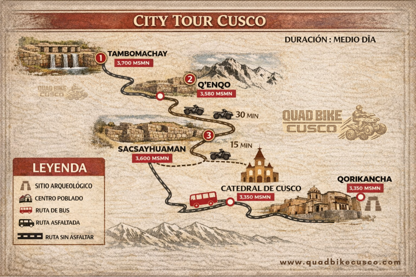 Luego, se visita el Qoricancha o Templo del Sol, uno de los centros religiosos más importantes del mundo inca, reconocido por la perfecta fusión entre la arquitectura inca y colonial. El tour continúa hacia los complejos arqueológicos que rodean la ciudad, destacando Sacsayhuamán, Qenqo, Puca Pucara y Tambomachay, impresionantes vestigios que revelan el legado histórico y ceremonial de la cultura inca.