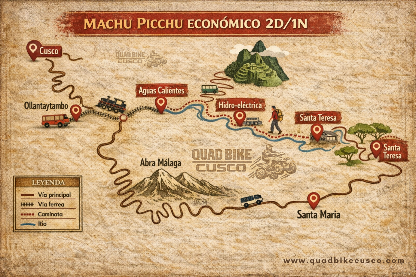 Continuando la ruta, pasaremos por Santa María (1,500 m s. n. m.), un poblado tropical conocido por su gran producción de frutas, y luego por Santa Teresa, donde realizaremos una breve parada para adquirir el pasaje del tren local Hidroeléctrica – Aguas Calientes (aprox. S/ 5.00, sujeto a disponibilidad). Posteriormente continuaremos hasta llegar a Hidroeléctrica, donde tendremos tiempo para almorzar y recargar energías antes de iniciar la caminata.