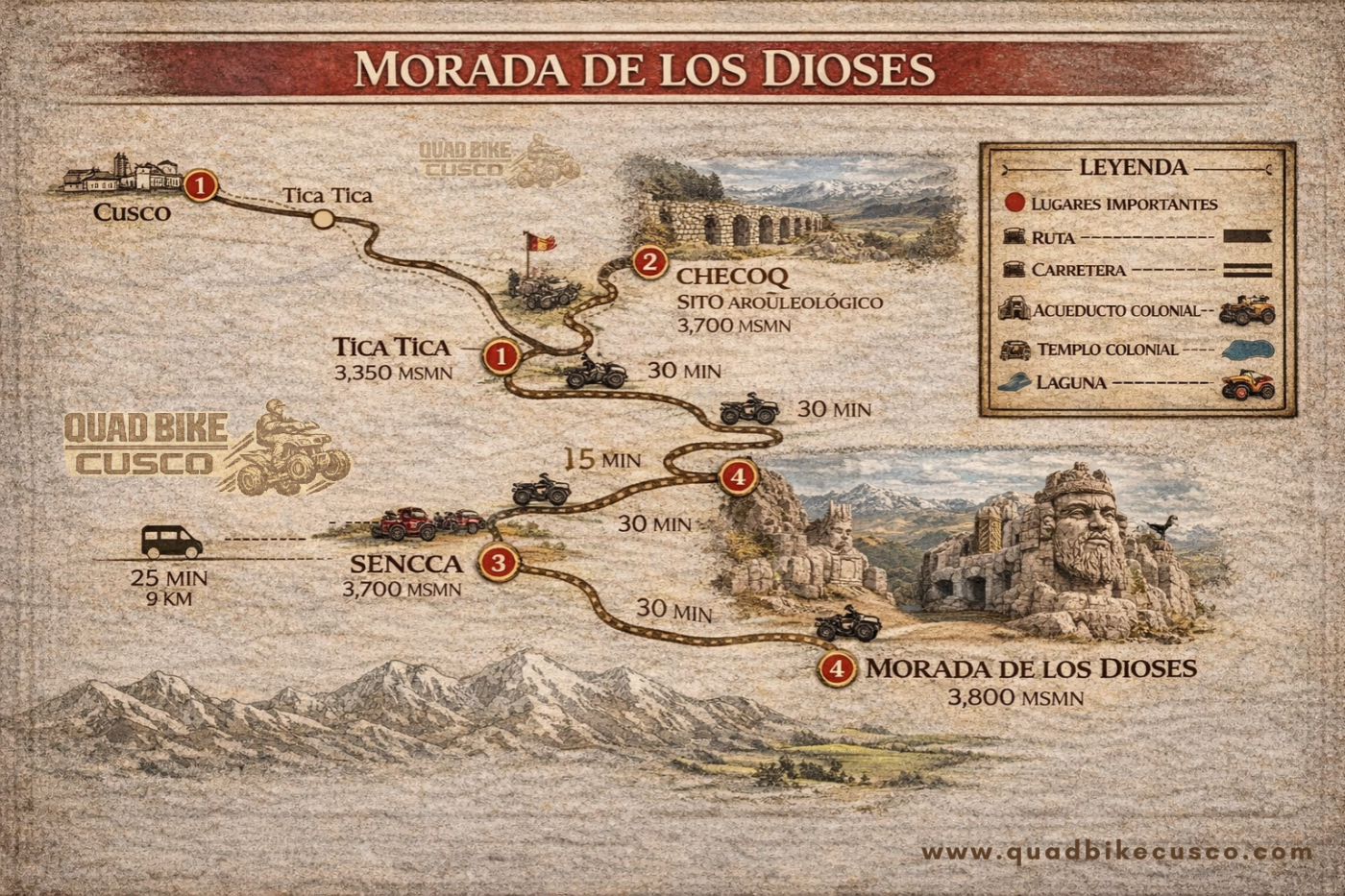 El Tour en Cuatrimotos a la Morada de los Dioses es una experiencia ideal para quienes buscan aventura y cultura en los alrededores de Cusco. Con QUAD BIKE CUSCO, recorrerás rutas rurales en cuatrimoto, visitando el Acueducto Colonial Fortaleza y la impresionante Morada de los Dioses, un espacio artístico rodeado de paisajes naturales.
